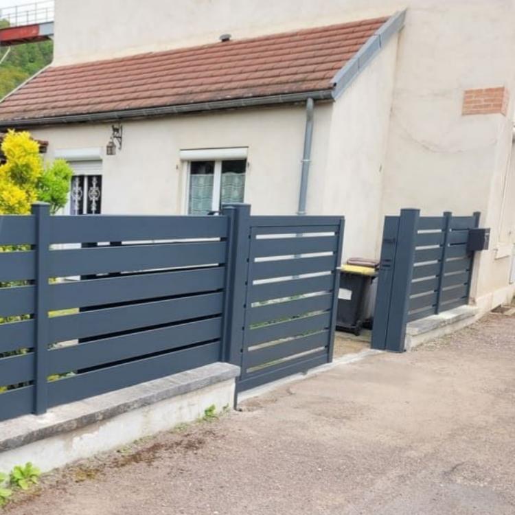 Pour une harmonie parfaite, le portillon et la clôture reprennent le design de votre portail en aluminium, alliant élégance et robustesse.